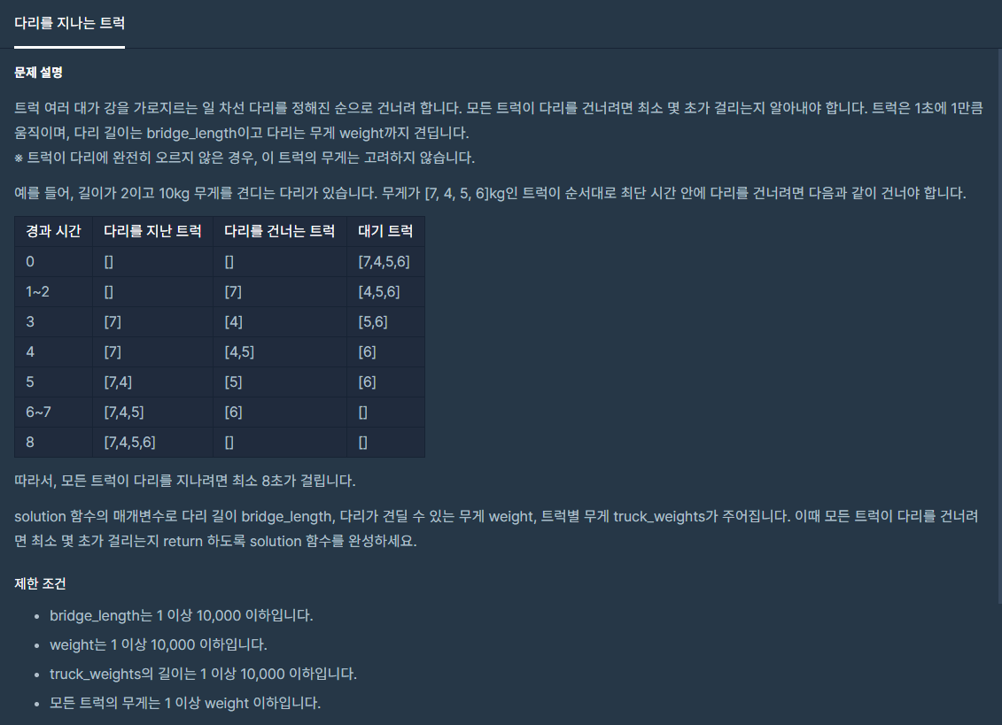 다리를 Queue로 만들어놓고 반복문으로 모든 트럭이 빠질때까지 반복문을 실행하고 조건을 걸어준다