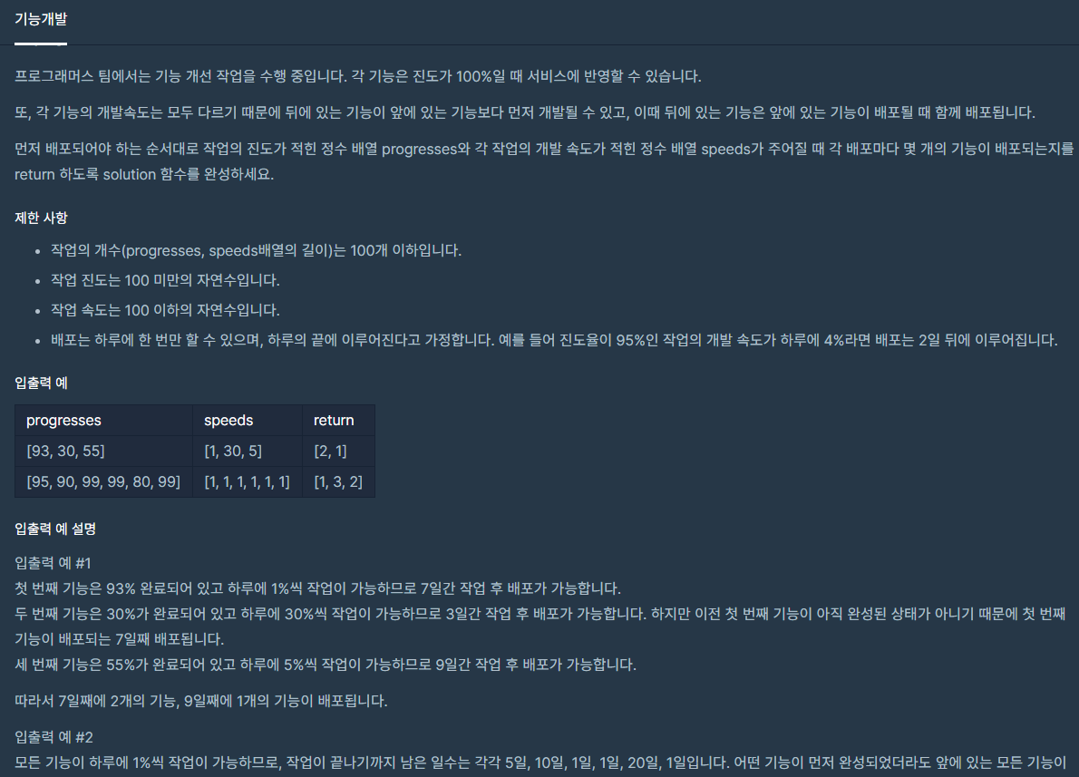 λ¨Όμ λ°°ν¬λμ΄μΌ νλ μμλλ‘ μμ μ μ§λκ° μ ν μ μ λ°°μ΄ progressesμ κ° μμ μ κ°λ° μλκ° μ ν μ μ λ°°μ΄ speedsκ° μ£Όμ΄μ§ λ κ° λ°°ν¬λ§λ€ λͺ κ°μ κΈ°λ₯μ΄ λ°°ν¬λλμ§λ₯Ό return νλλ‘ solution ν¨μλ₯Ό μμ±νμΈμ.